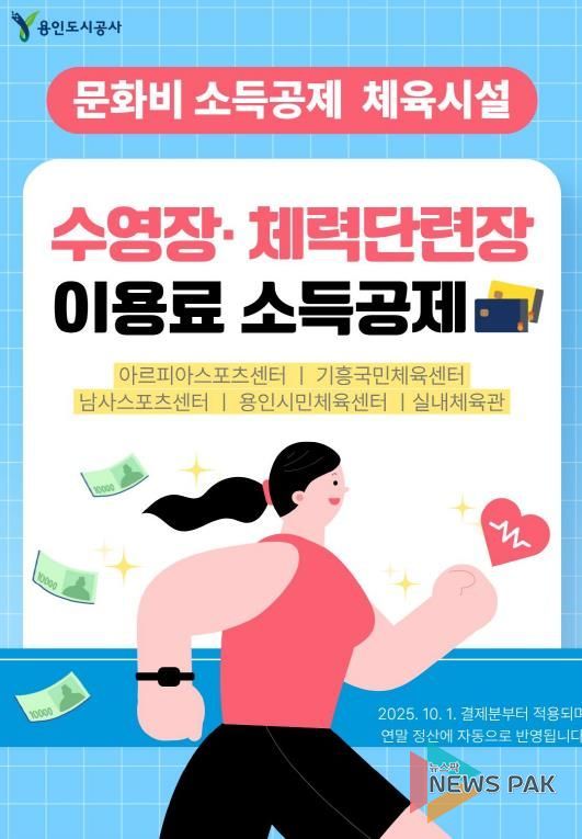 뉴스팍 배상미 기자 | 용인도시공사는 시민들의 건강 증진과 여가 복지 확대를 위해 오는 10월 1일부터 수영장‧체력단련장 시설 이용료와 강습비에 대해 문화비 소득공제 혜택을 적용한다고 밝혔다.