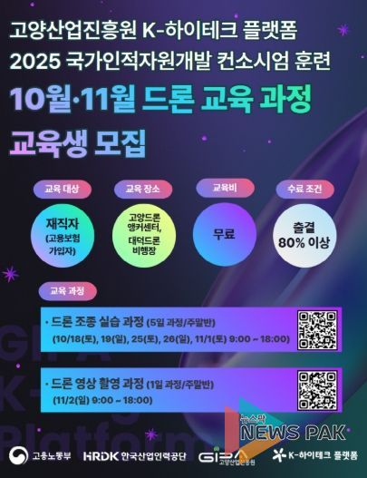 뉴스팍 배상미 기자 | 고양산업진흥원 K-하이테크플랫폼지원단이 고용노동부와 한국산업인력공단이 주관하는 국가인적자원개발 컨소시엄 사업의 일환으로, 드론·생성형 AI 교육과정 교육생을 모집한다고 밝혔다.