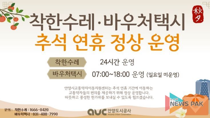 뉴스팍 배상미 기자 | 안양시가 오는 추석 연휴 기간(10.3.~10.9.)에 교통약자의 이동권 보장을 위한 특별교통수단 이동지원서비스 ‘착한수레’와 ‘바우처택시’를 정상 운행한다고 1일 밝혔다.