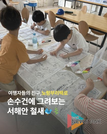 ▲‘여행자들의 친구, 노랑부리백로’는 대부도와 안산 지역의 생태·문화적 가치를 발굴하는 ’사회적협동조합 지지네이쳐’ 가 운영한다. 프로그램은 시화호와 대부도에 찾아오는 다양한 새들을 알아보고, 손수건에 그려진 새들을 관찰하며 직접 색칠하는 체험으로 구성된다. 단순한 그리기를 넘어 습지의 중요성과 생물 다양성의 가치를 이해하고, 완성된 손수건을 활용해 기후변화 대응과 탄소중립 실천의 의미를 되새기도록 기획됐다.