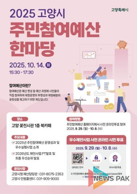 뉴스팍 배상미 기자 | 고양특례시는 오는 10월 14일 오후 3시 30분, 일산호수공원 고양꽃전시관(북카페)에서 ‘2025년 고양특례시 주민참여예산 한마당’을 개최한다고 밝혔다.