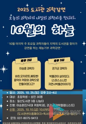뉴스팍 배상미 기자 | 고양특례시 일산도서관에서는 과학자들의 재능기부 도서관 과학 강연프로그램 ‘10월의 하늘’을 운영한다.