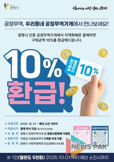뉴스팍 배상미 기자 | 광명시가 공정무역가게에서 광명사랑화폐(지역화폐)로 결제하면 결제금액의 10%를 돌려주는 ‘공정무역 실천 캐시백’ 행사를 진행한다고 9일 밝혔다.