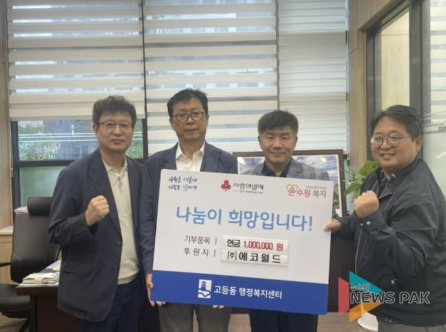 뉴스팍 배상미 기자 | 수원시 팔달구 고등동은 10월 13일, 사회적기업 ㈜에코월드로부터 관내 취약계층을 위한 이웃돕기 성금 100만원을 전달받았다고 밝혔다.