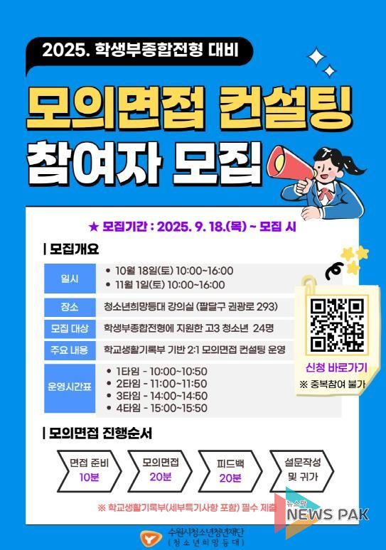 뉴스팍 배상미 기자 | 수원시청소년청년재단 청소년희망등대는 2026학년도 대학입시를 준비하는 청소년들을 대상으로 ‘학생부종합전형 모의면접 컨설팅’ 프로그램을 운영하며, 9월 18일부터 참가자를 모집중이다.