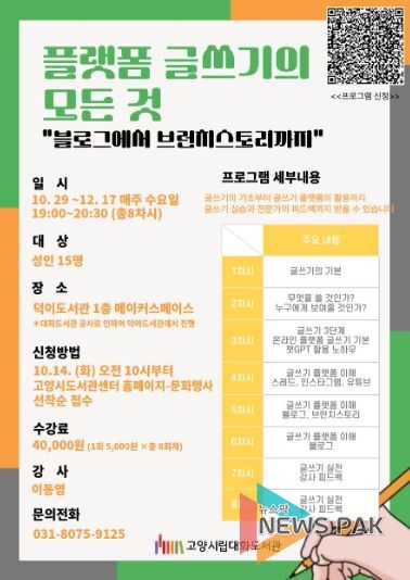 뉴스팍 배상미 기자 | 고양특례시 대화도서관에서는 글쓰기의 기초부터 글쓰기 플랫폼의 활용까지 배워볼 수 있는 독서문화 프로그램‘플랫폼 글쓰기의 모든 것’을 10월 29일부터 운영한다.