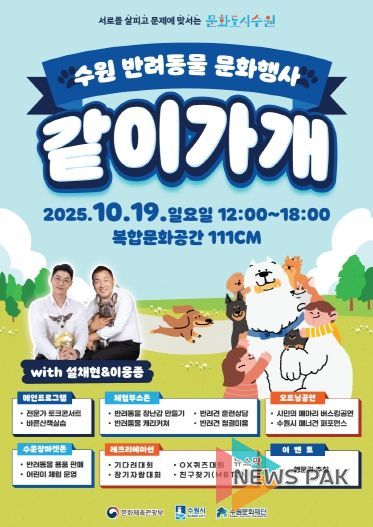 뉴스팍 배상미 기자 | 수원문화재단(대표이사 오영균)이 오는 10월 19일 일요일 복합문화공간 111CM 야외에서 반려동물 문화행사 “같이가개”를 개최한다.