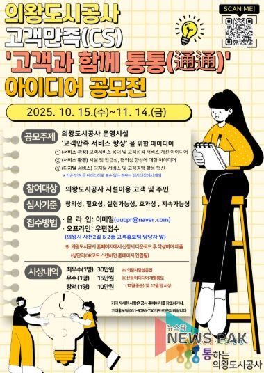 뉴스팍 배상미 기자 | 의왕도시공사는 고객만족(CS) 아이디어 공모전‘고객과 함께 통통(通通)’을 추진한다고 밝혔다.