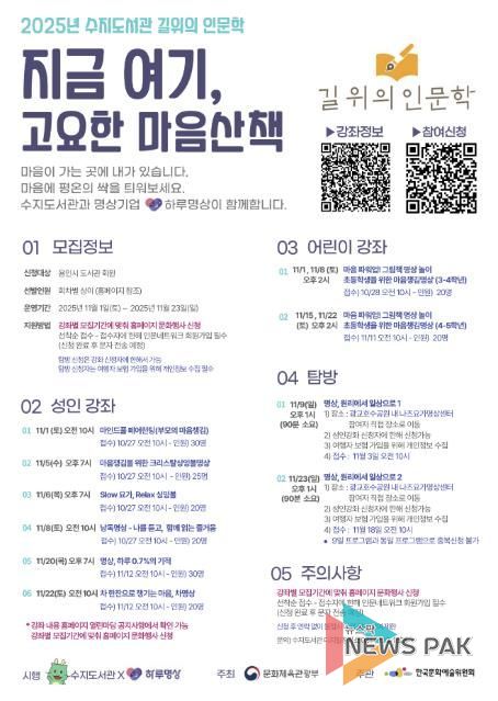 뉴스팍 배상미 기자 | 용인특례시 수지도서관은 오는 11월 1일부터 23일까지 ‘2025년 길 위의 인문학’ 프로그램 ‘지금 여기, 고요한 마음 산책’을 운영한다고 17일 밝혔다.