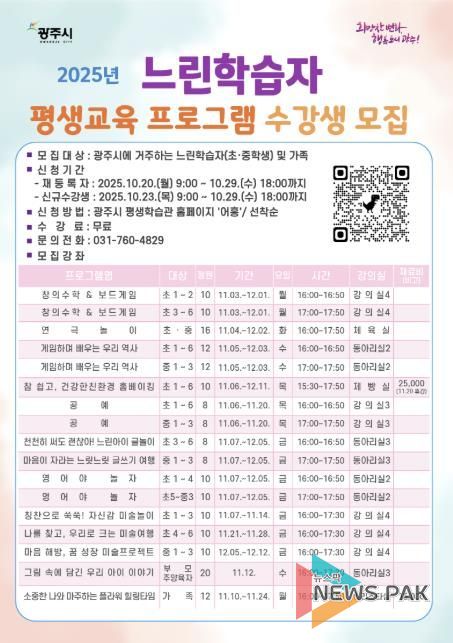 뉴스팍 이화형 기자 | 광주시는 느린 학습자 초·중등학생과 그 가족을 대상으로 맞춤형 평생교육 프로그램을 운영한다고 17일 밝혔다.