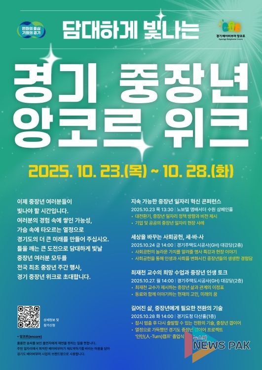 뉴스팍 배상미 기자 | 경기도가 중장년 세대의 도약과 성장을 지원하기 위해 23일부터 28일까지 6일간 ‘경기 중장년 앙코르 위크(week)’을 개최한다.