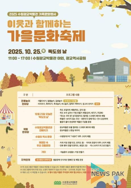 뉴스팍 배상미 기자 | 수원광교박물관은 독도의 날인 10월 25일 오전 11시부터 오후 5시까지 수원광교박물관 야외(광교역사공원)에서 ‘2025 수원광교박물관 가족문화행사–이웃과 함께하는 가을문화축제’를 연다.