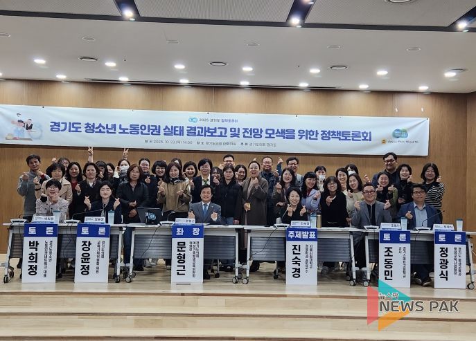 뉴스팍 배상미 기자 | 문형근 경기도의회 위원장(더불어민주당, 안양3)이 좌장을 맡은 '경기도 청소년 노동인권 실태 결과보고 및 전망 모색'을 위한 정책토론회가 10월 23일 경기도의회 대회의실에서 개최됐다. 본 토론회는 경기도와 경기도의회가 공동으로 주최하는 ‘2025 경기도 정책토론회’의 일환으로 개최됐다.