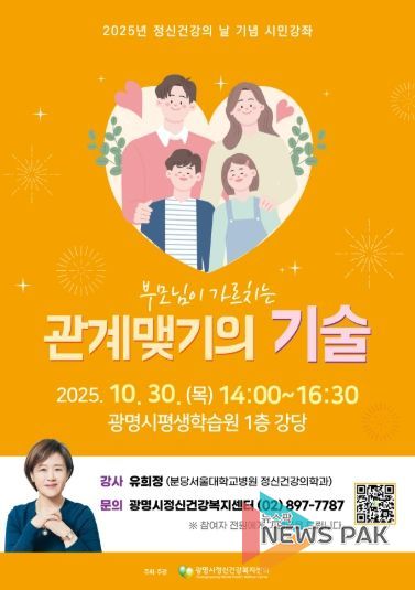 뉴스팍 배상미 기자 | 광명시 정신건강복지센터는 오는 30일 오후 2시 광명시평생학습원에서 ‘2025년 정신건강의 날’을 기념해 시민강좌를 개최한다.