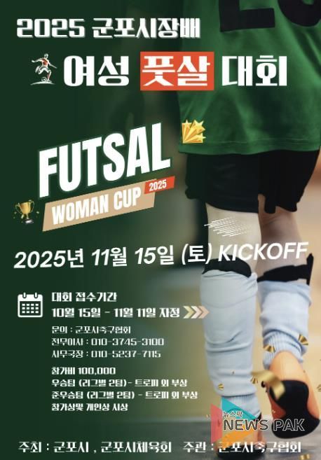 뉴스팍 배상미 기자 | 군포시는 여성 생활체육 참여 확대와 건전한 스포츠 문화 확산을 위해 ‘2025 군포시장배 여성 풋살대회’를 오는 11월 15일(토) 군포시 국민체육센터 축구장에서 개최한다.