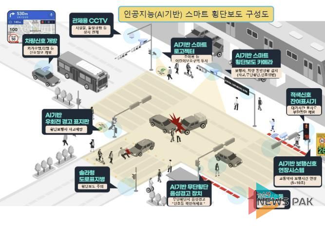AI 기반 스마트 횡단보도는 보행자의 움직임과 차량 접근을 실시간으로 감지하는 센서와 카메라를 통해 교통량·보행량 정보를 실시간으로 수집·분석한다.