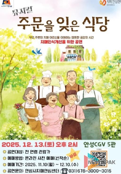 뉴스팍 배상미 기자 | 안성시보건소 치매안심센터는 오는 12월 13일 오후 2시, 안성 CGV에서 치매에 대한 올바른 이해와 공감 확산을 위한 치매인식개선 뮤지컬 '주문을 잊은 식당'공연을 무료로 개최한다.