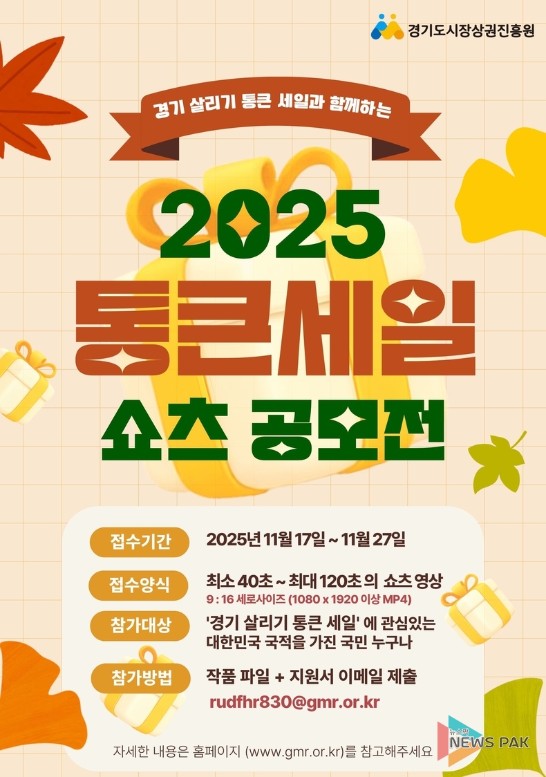 뉴스팍 배상미 기자 | 경기도시장상권진흥원(이하 경상원)이 총 상금 200만 원 규모의 ‘2025년 하반기 경기 살리기 통큰 세일 영상 공모전’을 오는 17일부터 개최하고 창의적인 영상 제작자들을 모집한다고 13일 밝혔다.