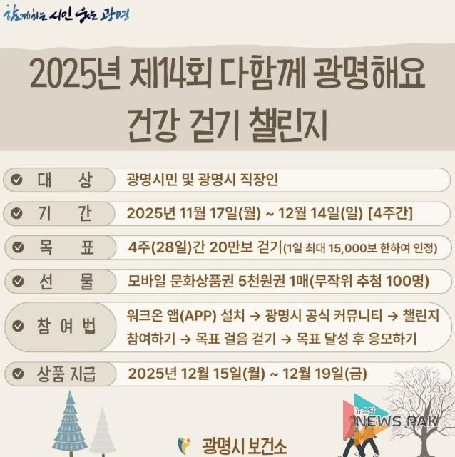 뉴스팍 배상미 기자 | 광명시 보건소는 시민의 건강한 생활습관 형성과 신체활동 증진을 위해 오는 17일부터 12월 14일까지 4주간 두 가지 건강 걷기 챌린지를 운영한다.
