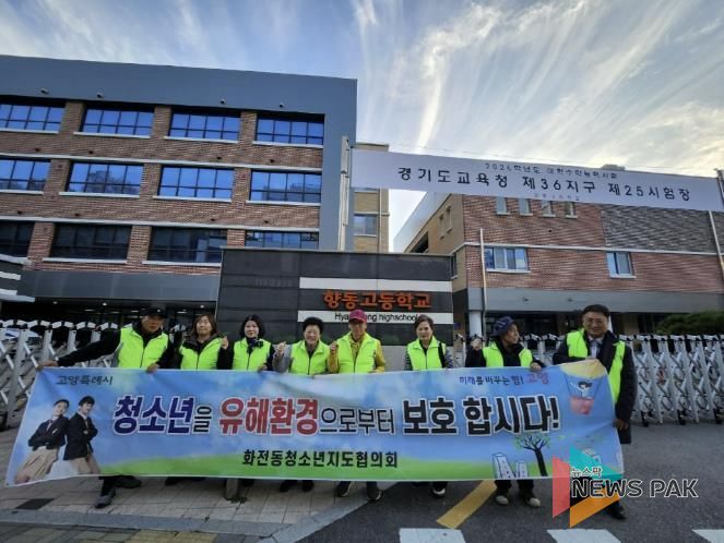 뉴스팍 배상미 기자 | 고양특례시 덕양구 화전동 청소년지도협의회는 지난 13일, 2026학년도 대학수학능력시험이 실시된 향동고등학교 앞에서 수험생 응원과 함께 청소년 유해환경 정화 캠페인을 전개했다.
