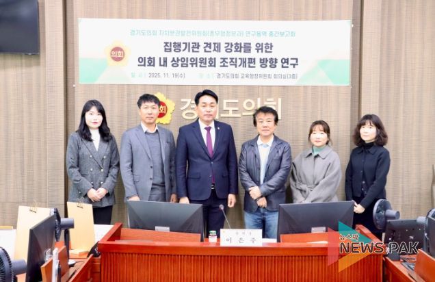 뉴스팍 배상미 기자 | 경기도의회 자치분권발전위원회 총무행정분과 이은주 위원장(국민의힘, 구리2)은 11월 19일, 「집행기관 견제 강화를 위한 의회 내 상임위원회 조직개편 방향 연구」 중간보고회를 주재했다. 이번 회의는 지난 9월 29일 열린 착수보고회 이후 연구 추진 경과를 점검하고, 향후 연구 방향을 구체화하기 위해 마련됐다.
