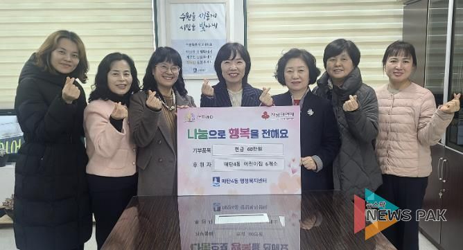 민상희 매탄4동장은 “어린이집 원장님들께서 보여주시는 꾸준한 이웃사랑이 우리 아이들에게 좋은 본보기가 되고 있다”며 “전달된 성금은 따뜻한 마음이 온전히 전해질 수 있도록 꼭 필요한 곳에 소중하게 사용하겠다”고 감사의 마음을 전했다.