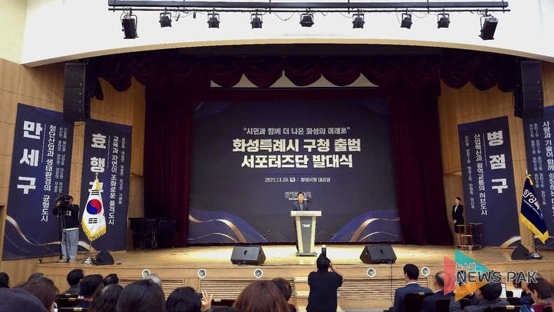 뉴스팍 배상미 기자 | 배정수 화성시의회 의장이 20일 화성시청 대강당에서 열린 ‘화성특례시 구청 출범 서포터즈단 발대식’에 참석해, 내년 2월로 예정된 4개 구청(만세·효행·병점·동탄) 시대의 개막을 축하하며 의회 차원의 전폭적인 지원을 약속했다.
