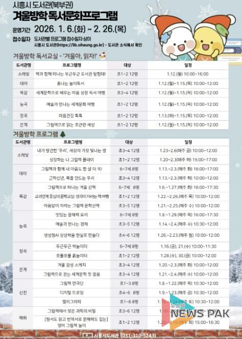 뉴스팍 배상미 기자 | 시흥시는 겨울방학을 맞아 북부권 8개 공공도서관(소래빛ㆍ대야ㆍ목감ㆍ능곡ㆍ장곡ㆍ은계ㆍ신천ㆍ매화)에서 1월 6일부터 2월 26일까지 겨울독서교실 및 겨울방학 프로그램을 운영한다.