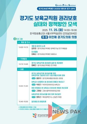 뉴스팍 배상미 기자 | 경기도여성가족재단은 오는 25일 오후 2시 한국방송통신대학교 서울서부학습센터에서 ‘경기도 보육교직원 권리보호 실태와 정책방안 모색’을 주제로 정책토론회를 개최한다.