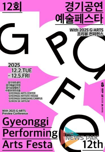 뉴스팍 배상미 기자 | 경기문화재단은 경기도 수원 일대에서 제12회 경기공연예술페스타를 개최한다. 페스타는 2025년 12월 2일부터 5일까지 경기 예술인의 집, 경기아트센터, 경기상상캠퍼스, 수원SK아트리움 등에서 진행되며, 베스트콜렉션, 쇼케이스 데이, 공동 창·제작 쇼케이스, 피치세션, 토크세션, 워크숍 등 다양한 프로그램을 통해 경기 공연예술 생태계의 흐름과 성과를 한눈에 보여줄 예정이다. 또한 경기아트센터 주최 ‘2025 G-ARTS 프리뷰 컨퍼런스’가 동시 개최되며, 보다 풍성한 전문 교류의 장을 마련한다.