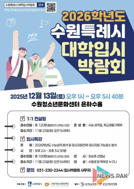 뉴스팍 배상미 기자 | 수원시청소년청년재단청소년희망등대는 2026학년도 대입을 준비하는 수험생과 학부모를 위해 오는 12월 13일 수원청소년문화센터에서 ‘수원특례시 2026학년도 대학입시박람회’를 개최한다. 박람회는 이날 오후 1시부터 5시 40분까지 진행된다.