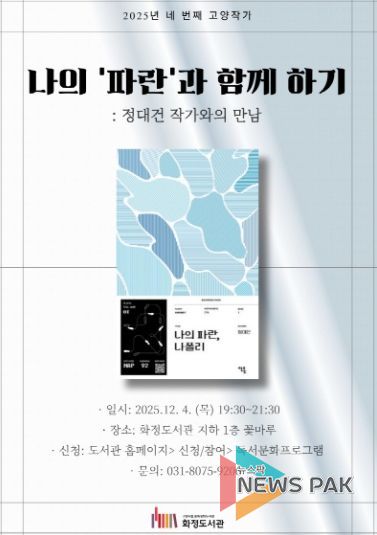뉴스팍 배상미 기자 | 고양특례시는 오는 12월 4일 오후 7시 30분부터 9시 30분까지, 화정도서관 지하 1층 꽃마루에서 고양작가 연계 프로그램 『나의 ‘파란’과 함께 하기: 정대건 작가와의 만남』을 운영한다고 밝혔다.