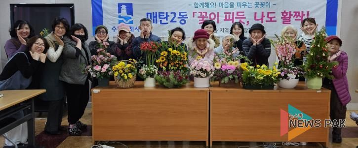 뉴스팍 배상미 기자 | 지난 1일, 매탄2동 지역사회보장협의체는 특화사업 중 하나인 ‘꽃이 피듯, 나도 활짝!’꽃꽂이 교실을 마무리하며 어르신들의 작품으로 ‘우리들의 작은전시회’를 매탄2동 행정복지센터 민원실에 개최했으며, 4일까지 전시한다.