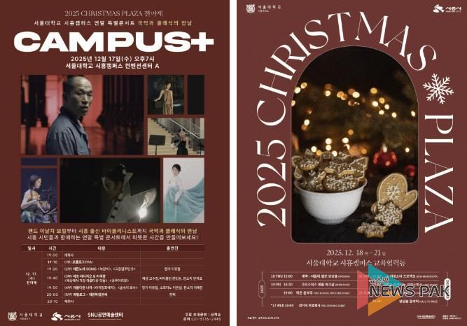 뉴스팍 배상미 기자 | 시흥시와 서울대학교 시흥캠퍼스가 오는 12월 17일부터 21일까지 특별 행사인 ‘2025 크리스마스 플라자(CHRISTMAS PLAZA)’를 개최한다. 올해 행사는 단 하루만 열리는 전야제 특별콘서트 ‘캠퍼스 플러스’를 중심으로, 국악과 클래식을 대표하는 최정상급 연주자들이 한자리에 모여 연말 분위기를 고조시킬 예정이다.