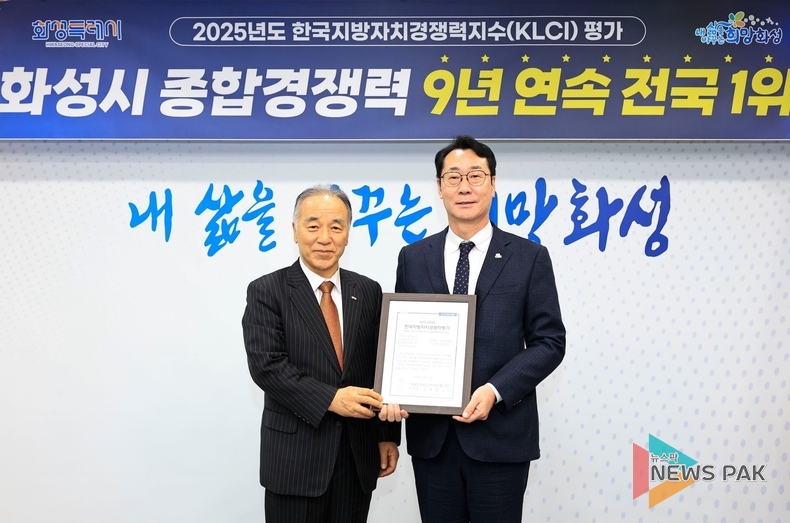화성특례시는 2025년 한국지방자치경쟁력지수(KLCI) 조사에서 9년 연속 전국 1위라는 전무후무한 대기록을 달성했다. 지난 18일 시청 중앙회의실에서 열린 인증서 전달식에는 정명근 화성시장과 (사)한국공공자치연구원 관계자들이 참석해 이 역사적인 성과를 기념했다.