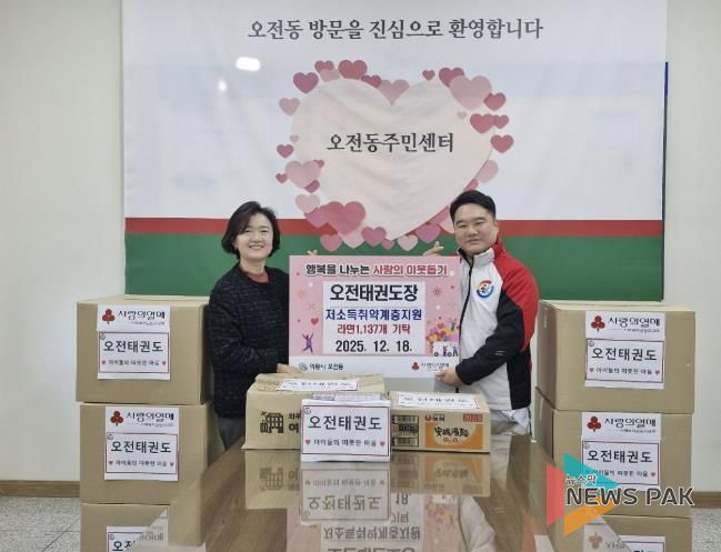 뉴스팍 배상미 기자 | 의왕시 오전동에 위치한 오전태권도장의 지도자와 수련생들이 12월 18일, 지역사회의 어려운 이웃을 위해 라면 1,137개를 기부했다.