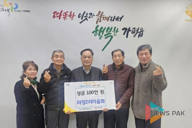 뉴스팍 배상미 기자 | 가평군 가평읍 마장2리 마을회는 최근 행정복지센터를 방문해 취약계층 이웃을 돕기 위한 성금 100만 원을 전달했다.