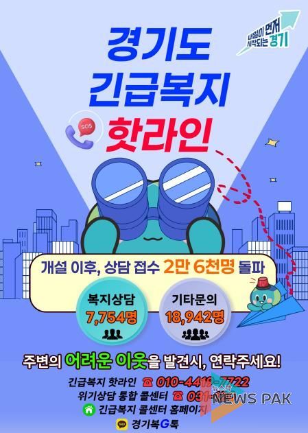 경기도가 2022년 8월부터 위기도민 발굴을 위해 ‘긴급복지 핫라인’을 운영한 결과 3년 3개월 만에 상담 접수 2만 6천 명을 넘어섰다.