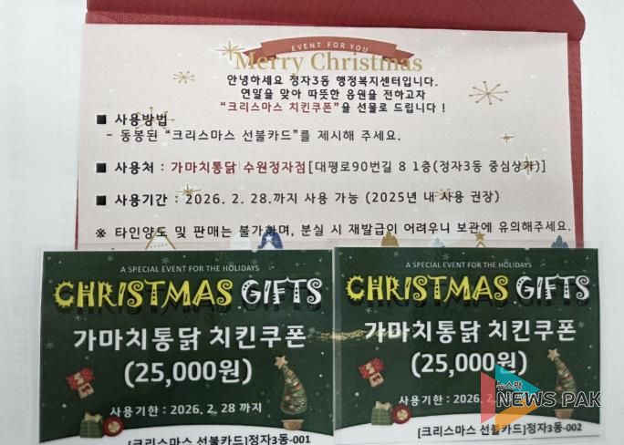 뉴스팍 배상미 기자 | 수원시 장안구 정자3동은 지난 18일 관내 저소득 한부모가족 33세대에 치킨쿠폰을 전달하며 연말 온정을 전했다.