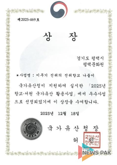 뉴스팍 이소율 기자 | 평택문화원은 12월 18일 대전 전통나래관 다목적강당에서 열린 국가유산청 주최 ‘2025 우리고장 국가유산 활용 우수사업 시상식’에서 평택문화원의 ‘이무기 진위의 진위향교 나들이’가 우수사업(국가유산청장상)으로 수상했다.