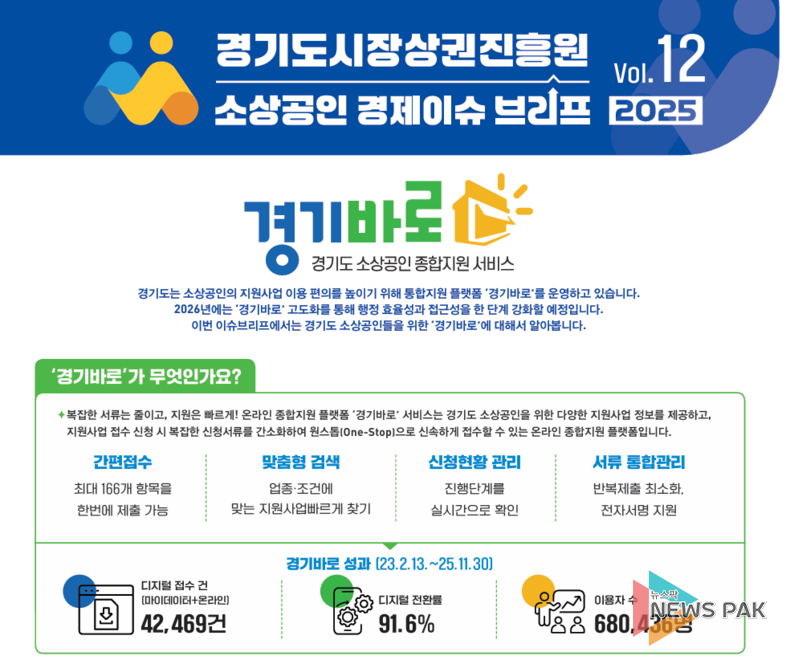 뉴스팍 배상미 기자 | 경기도시장상권진흥원(이하 경상원)이 도내 소상공인의 행정 편의를 획기적으로 높인 통합지원 플랫폼 ‘경기바로’의 성과를 분석하고, 인공지능(AI) 기반의 미래 청사진을 제시했다.