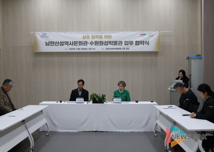 뉴스팍 배상미 기자 | 남한산성역사문화관과 수원화성박물관은 2025년 12월 23일, 남한산성역사문화관에서 세계유산 성곽의 연구·보존·활용을 위한 업무협약(MOU)을 체결했다.