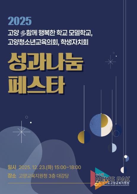 뉴스팍 배상미 기자 | 고양교육지원청은 12월 23일 고양교육지원청 3층 대강당에서 ‘2025 고양 다함께 행복한 학교’모델학교 및 고양청소년교육의회·학생자치회 성과나눔 페스타를 개최했다.