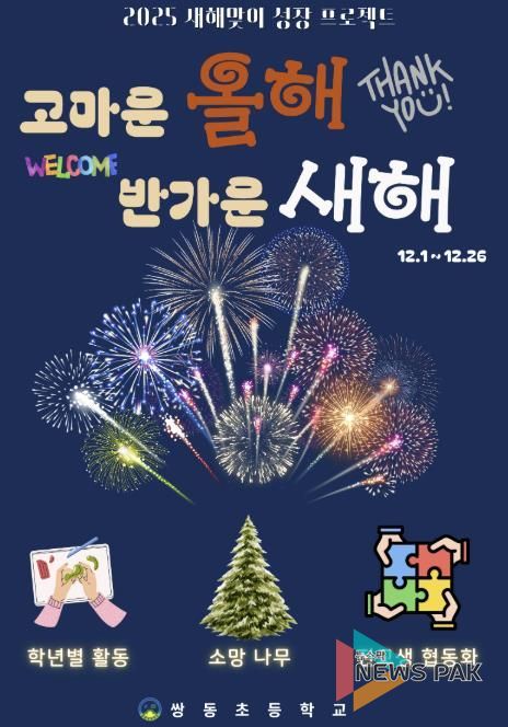 뉴스팍 류은정 기자 | 쌍동초등학교는 연말연시를 맞아 전교생이 참여하는 ‘고마운 올해, 반가운 새해’ 새해맞이 성장 프로젝트를 진행했다. 학생들은 한 해를 돌아보고 감사의 마음을 표현하며, 새해 목표를 시각적으로 드러내는 다양한 활동을 경험했다.