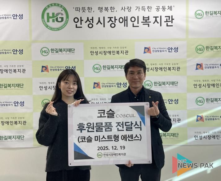 뉴스팍 배상미 기자 | 사회복지법인 한길복지재단에서 수탁하고 있는 안성시장애인복지관은 지난 12월 16일, 코스메틱 브랜드 코슬(COSEUL)로부터 미스트형 에센스 50개(약 2,900,000원 상당)를 기부받았다고 밝혔다.