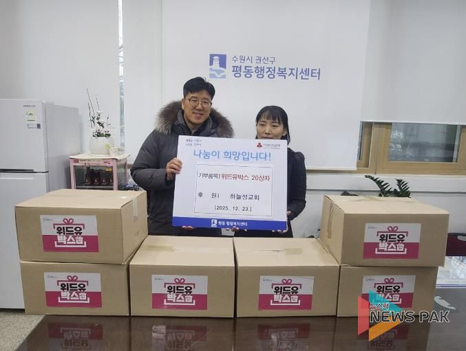 뉴스팍 배상미 기자 | 수원시 권선구 고색동 소재 하늘성교회는 지난 23일 성탄절을 맞이하여 '위드유박스' 21박스를 평동 행정복지센터에 전달했다.