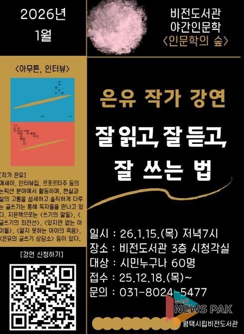 뉴스팍 이소율 기자 | 평택시 비전도서관은 다음 달 1월 15일 저녁 7시 은유 작가를 초청하여 ‘잘 읽고, 잘 듣고, 잘 쓰는 법’을 주제로 야간 인문학 강연을 진행한다.