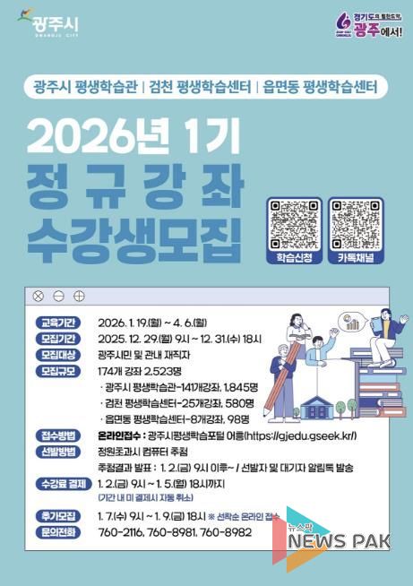 뉴스팍 이화형 기자 | 광주시는 12월 29일부터 31일까지 평생학습관, 검천평생학습센터 및 읍면동 평생학습센터에서 운영하는 2026년 제1기 평생학습 프로그램 수강생을 모집한다고 26일 밝혔다.