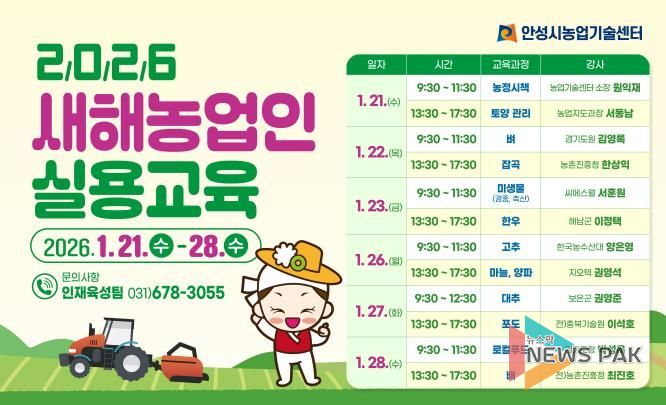 뉴스팍 배상미 기자 | 안성시는 오는 26년 1월 21일부터 28일까지 6일간 새해농업인 실용교육을 12회 추진한다고 밝혔다.