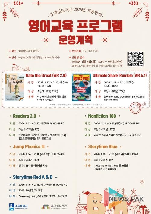 뉴스팍 배상미 기자 | 수원시 호매실도서관이 겨울방학 기간 진행하는 영어교육프로그램 참가자를 모집한다. 이성숙 강사(이화여대 TESOL학 석사)가 강의한다.
